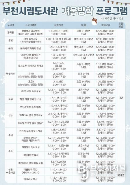 브릿지저널 김경미 기자 | 부천시는 겨울방학을 맞아 내년 1월부터 2월까지 부천시립도서관에서 전 연령을 대상으로 독서문화 프로그램과 행사를 운영한다고 30일 밝혔다. 이번 프로그램은 연령과 관심사에 따라 다양한 참여 기회를 제공하기 위해 마련됐다.