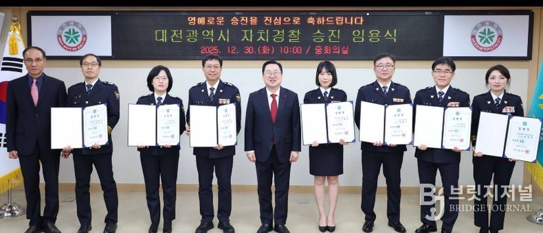 브릿지저널 정보영 기자 | 대전시 자치경찰위원회는 30일 대전시청 중회의실에서 이장우 대전시장과 박희용 자치경찰위원장, 동료 직원들이 참석한 가운데 자치경찰 승진 임용식을 개최했다.