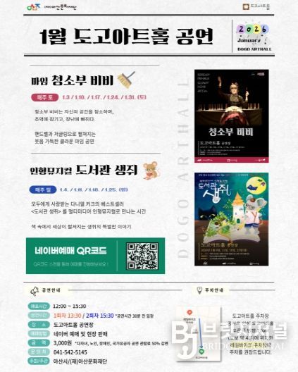 브릿지저널 정보영 기자 | 아산문화재단(대표이사 유성녀)이 운영하는 도고아트홀이 2026년 1월, 주말 상시 공연과 전시를 통해 새해 시민들의 문화 일상화를 이어간다. 이번 프로그램은 가족 단위 관람객과 어린이를 중심으로 공연과 전시를 함께 즐길 수 있도록 구성돼 있어, 새해 첫 달부터 풍성한 문화 향유 기회를 제공한다.