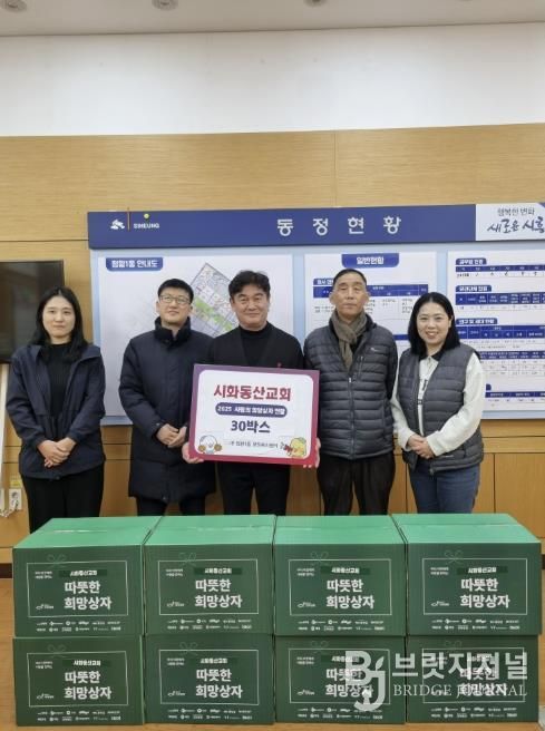브릿지저널 김경미 기자 | 시흥시 정왕1동 행정복지센터에 지난 12월 30일 시화동산교회가 방문해 관내 어려운 이웃을 돕기 위해 ‘희망상자’ 30개를 전달했다.