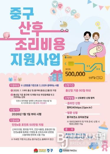 브릿지저널 김경미 기자 | 인천시 중구는 출산 가정의 경제적 부담을 덜어주기 위해 새해인 오는 2026년 1월 1일부터 ‘중구 산후조리비 지원 사업’을 본격적으로 시작한다고 밝혔다.