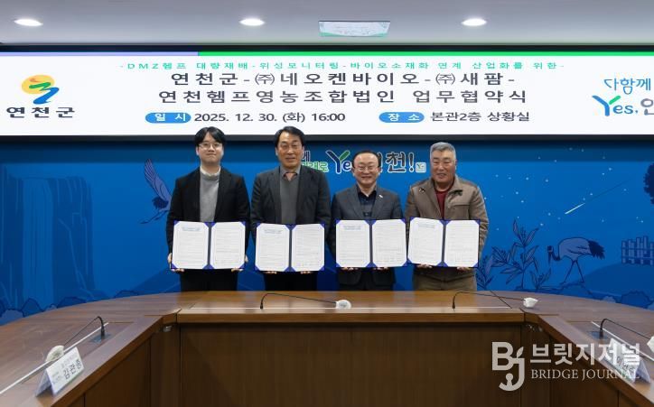 브릿지저널 김경미 기자 | 연천군은 지난 30일 연천군청 본관 2층 상황실에서 ㈜네오켄바이오, ㈜새팜, 연천헴프영농조합법인과 함께 DMZ 지역 헴프(대마) 산업의 체계적 육성과 산업화를 위한 업무협약을 체결했다.
