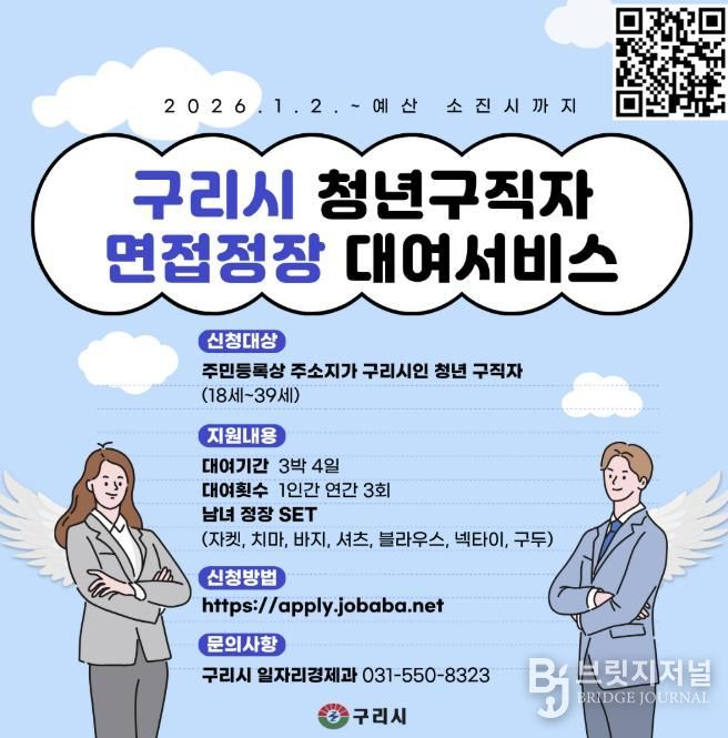 브릿지저널 김경미 기자 | 구리시는 관내 청년 구직자의 성공적인 취업을 지원하기 위해 2026년 청년 면접 정장 무료 대여 사업을 26년 1월 2일부터 본격 추진한다고 밝혔다.