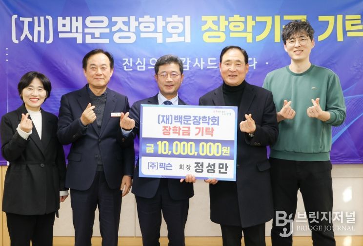 브릿지저널 김경미 기자 | 재단법인 백운장학회는 12월 31일 시청 만남실에서 정성만 (주)픽슨 회장을 비롯한 임직원이 참석한 가운데 장학금 기탁식을 개최했다.