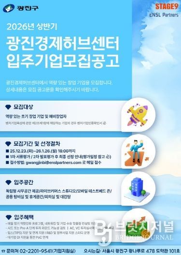 신청 기간은 2026년 1월 26일까지다. 광진구청 또는 엔슬파트너스 누리집에 게시된 서식에 따라 제출 서류를 준비해 이메일(gwangjinbi@enslpartners.com)로 접수하면 된다. 구는 기술성, 시장성, 사업성 등에 대한 평가와 심사를 거쳐 입주기업을 최종 선정하고 개별 안내할 예정이다. 자세한 사항은 광진경제허브센터 기업지원실(02-2201-9541)로 문의하면 된다.