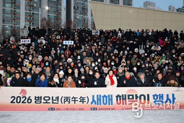 브릿지저널 김경미 기자 | 인천 동구는 1일 송현근린공원에서 각 동 주민자치회·자생단체 회원 등 다수의 구민이 참여한 ‘2026년 병오년 새해 맞이’행사를 개최했다고 밝혔다.