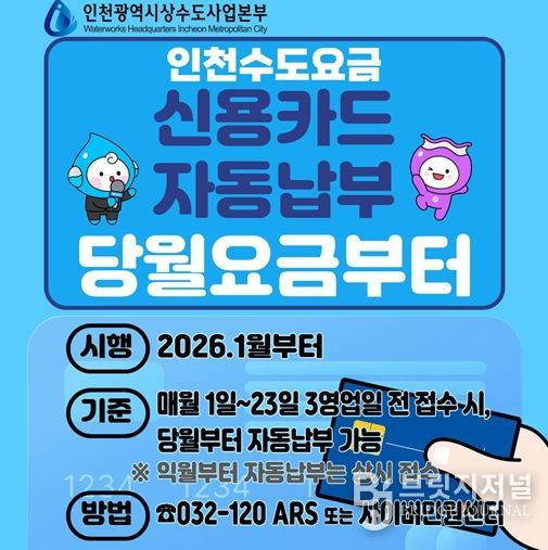 브릿지저널 김경미 기자 | 인천광역시 상수도사업본부는 시민 편의 중심의 수도요금 납부 환경을 조성하기 위해, 신용카드 자동납부를 신청한 달부터 바로 적용할 수 있도록 제도를 개선해 시행했다고 1월 2일 밝혔다.