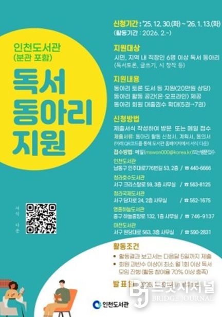 브릿지저널 김경미 기자 | 인천광역시 인천도서관 및 분관(청라호수, 청라국제, 영종하늘, 마전 도서관)은 시민들의 평생학습 역량 강화와 독서 공동체 활성화를 위해 ‘독서 동아리 지원사업’을 추진한다고 밝혔다.