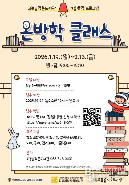 브릿지저널 윤나영 기자 | 김제시는 교동골작은도서관이 겨울방학을 맞아 아동을 위한 특별 프로그램인 ‘온(溫)방학 클래스’를 운영한다고 밝혔다.