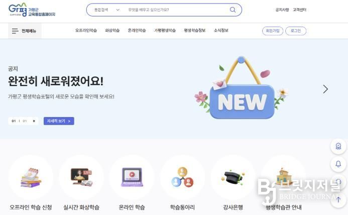 브릿지저널 김경미 기자 | 가평군이 올해부터 군민 모두가 함께 배우고 성장하는 평생학습도시 조성을 목표로 평생학습 홈페이지를 전면 개편해 새롭게 운영한다. 온라인 기반 학습 환경을 강화하고 교육 참여 기회를 확대하기 위한 조치다.