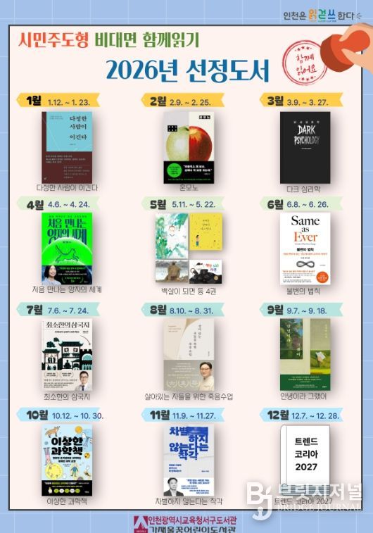 브릿지저널 김경미 기자 | 인천광역시교육청서구도서관은 12월 31일 ‘2026년 시민주도형 비대면 함께읽기’ 도서 15권을 선정·발표했다.