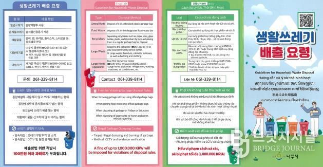 브릿지저널 김경미 기자 | 외국인 거주자와 근로자가 생활폐기물 배출 방법을 쉽게 이해하고 올바르게 실천할 수 있도록 나주시가 다국어 홍보물을 제작해 무단투기 예방과 쾌적한 도시환경 조성에 나선다.