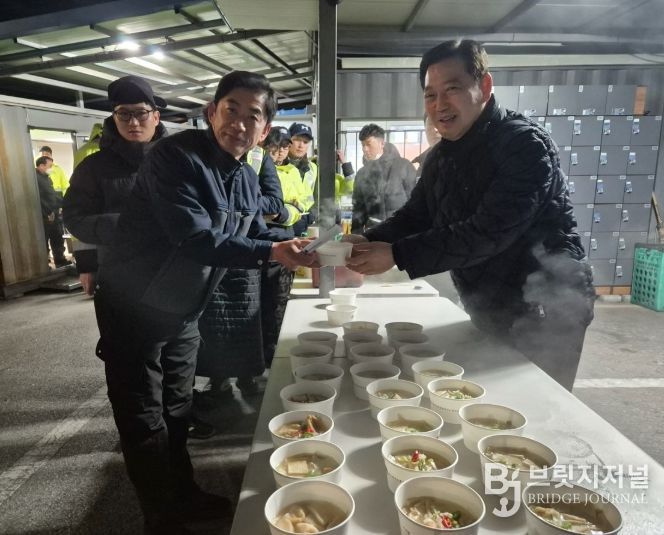 브릿지저널 김진석 기자 | 대구 남구의 조재구 남구청장이 병오년 새해 첫날 새벽, 앞산 큰골에 위치한 환경공무직 근무 현장을 찾아 이른 새벽부터 근무에 나선 환경공무직 직원들을 직접 만나 새해 덕담을 전하고, 떡국 한 그릇을 함께 나누며 감사의 마음을 전했다.