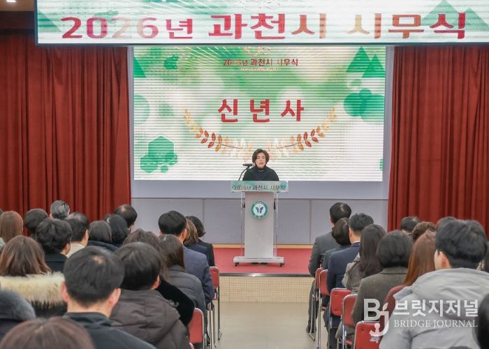 브릿지저널 김경미 기자 | 과천시는 2일 시청 대강당에서 시무식을 열고, 신계용 시장의 신년사 발표를 통해 시 승격 40주년을 맞는 2026년의 시정 운영 방향을 시민과 공유했다.