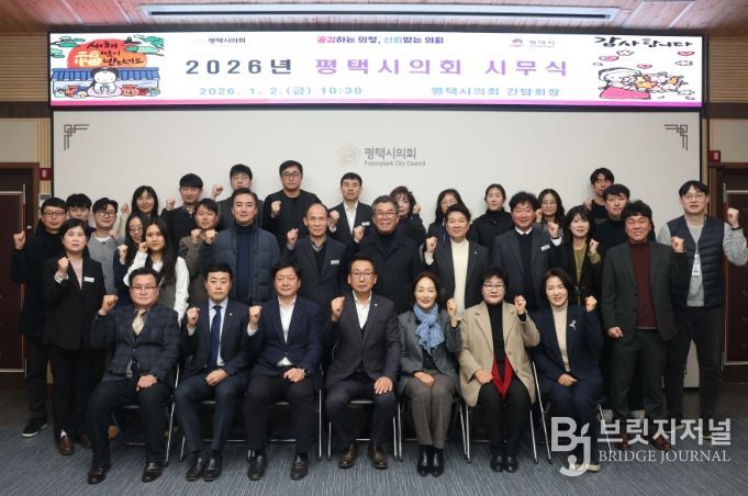 브릿지저널 김경미 기자 | 평택시의회는 2일, 시의회 간담회장에서 의원 및 의회사무국 직원 등 60여 명이 참석한 가운데 2026년 시무식을 가졌다.