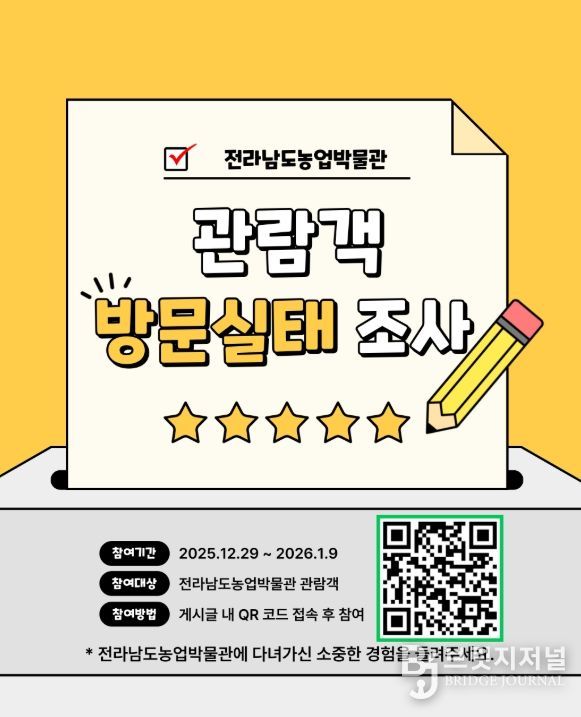 브릿지저널 김경미 기자 | 전라남도농업박물관이 관람객의 이용 실태를 파악하고, 농업박물관 어린이 복합문화관 건립에 대한 도민 인식을 수렴하기 위해 9일까지 총 2종의 설문조사를 실시한다.