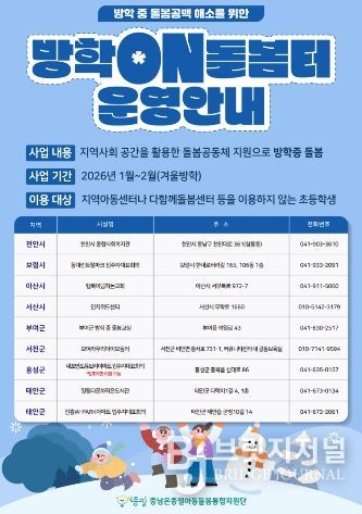 브릿지저널 정보영 기자 | 충남사회서비스원은 1월 2일부터 겨울방학 기간 동안 돌봄이 필요한 아동을 위해 방학ON돌봄터를 발굴하여 운영을 지원한다.