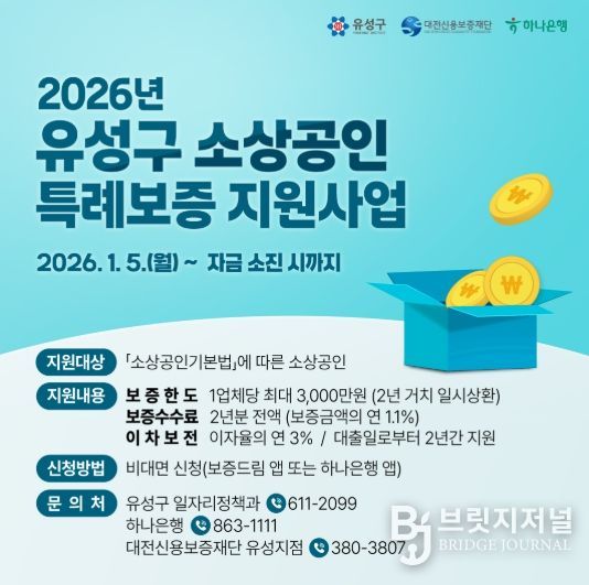 브릿지저널 정보영 기자 | 대전 유성구는 소상공인과 창업 기업의 금융 부담 완화를 위해 ‘2026년도 소상공인·창업 특례 보증 지원 사업’을 운영한다.