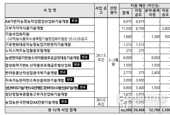 브릿지저널 정보영 기자 | 농림축산식품부는 1월 5일, 2026년도 농식품부 연구개발사업의 지원사업․내용․대상․일정 등을 담은 연구개발사업 시행계획을 통합 공고한다고 밝혔다.