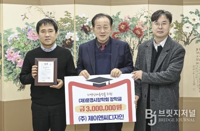 브릿지저널 정보영 기자 | (재)문경시장학회는 2일 ㈜제이엔씨디자인이 지역인재 육성을 위해 300만 원의 장학금을 문경시장학회에 기탁했다고 밝혔다.