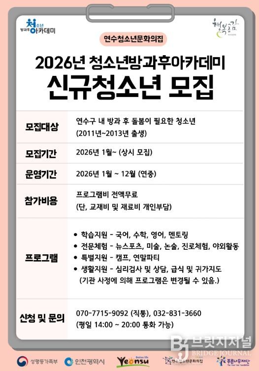 브릿지저널 김경미 기자 | 연수청소년문화의집은 연수구 내 14~16세 청소년(2011~2013년 출생)을 대상으로 2026년 ‘청소년방과후아카데미’ 신입생을 모집한다.