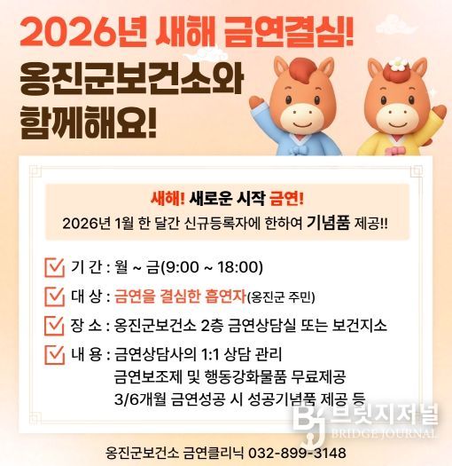 브릿지저널 김경미 기자 | 옹진군은 2026년 새해를 맞아 군민의 건강증진과 금연 실천을 지원하기 위해 금연클리닉을 본격 운영하고, 1월 신규 등록자를 대상으로 등록기념품을 제공하는 선착순 이벤트를 실시한다고 밝혔다.