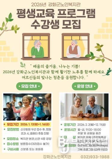 브릿지저널 김경미 기자 | 강화군노인복지관(관장 윤심)이 오는 12일~16일, 어르신들의 활기찬 노후와 평생학습 기회 확대를 위한 ‘2026년 평생교육 프로그램’ 수강생을 모집한다고 밝혔다.