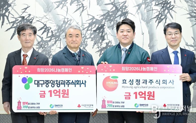 브릿지저널 김진석 기자 | 대구농수산물도매시장 법인 대구중앙청과㈜(대표 이용우, 이상윤)와 효성청과㈜(대표 김형수)는 1월 5일 대구광역시청 동인청사 접견실에서 대구사회복지공동모금회를 통해 총 2억 원(각 1억 원)의 희망 나눔 성금을 전달했다.