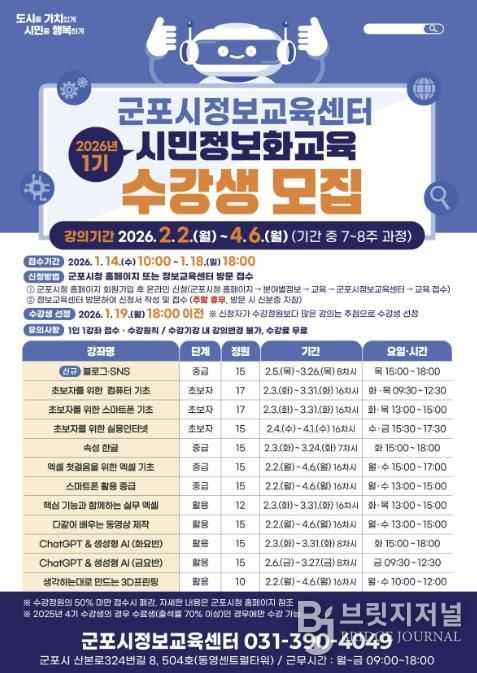 수강신청은 2026년 1월 14일 오전 10시부터 1월 18일 오후 6시까지 가능하며 군포시청 홈페이지 또는 군포시 정보교육센터(산본로324번길 8, 504호, 주말 휴무) 방문을 통해 신청할 수 있다.