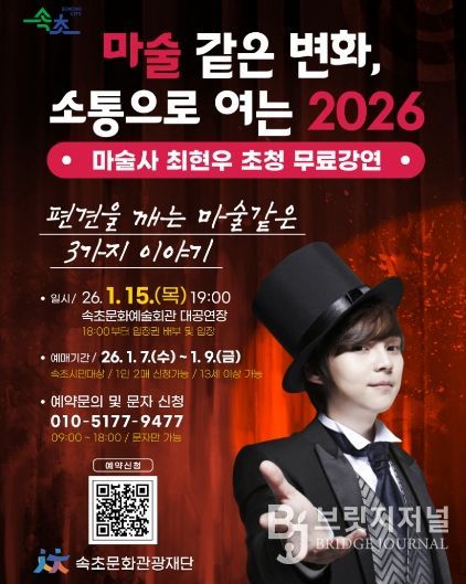 브릿지저널 윤나영 기자 | 속초문화관광재단이 오는 1월 15일 오후 7시, 속초문화예술회관 대공연장에서 마술사 최현우를 초청해 강연과 퍼포먼스가 결합한 기획공연 ‘마술 같은 변화, 소통으로 여는 2026’을 개최한다.