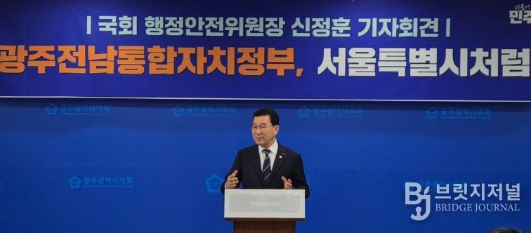 브릿지저널 김경미 기자 | 신정훈 국회 행정안전위원장은 오늘 광주광역시의회에서 기자회견을 열고 “광주·전남 대통합을 통해 분권형 국가로의 대전환을 이루고, 대한민국 재도약의 길을 열겠다”고 밝혔다.