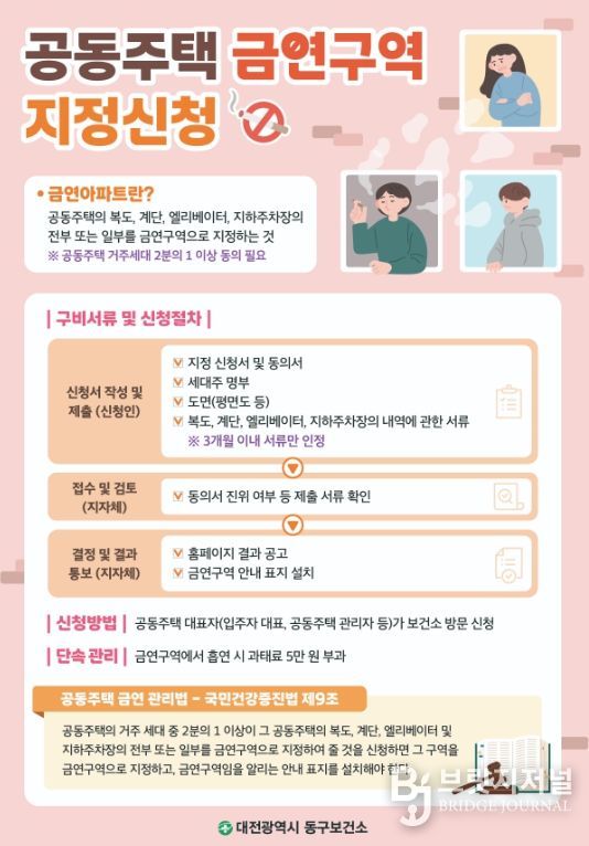 브릿지저널 정보영 기자 | 대전 동구는 공동주택 내 간접흡연 피해를 예방하고 쾌적한 주거환경을 조성하기 위해 ‘금연아파트’ 지정 사업을 추진, 이달 30일까지 신청‧접수를 받는다고 7일 밝혔다.