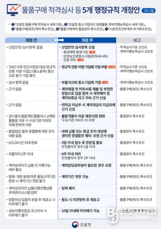 브릿지저널 김경미 기자 | 조달청은 안전한 노동환경 조성과 노동자의 고용안정, 부품 국산화 등 국정과제 이행을 지원하기 위해 ‘물품구매 적격심사 세부기준’을 포함한 5개 행정규칙을 개정하여 1월 1일부터 시행했다고 밝혔다.