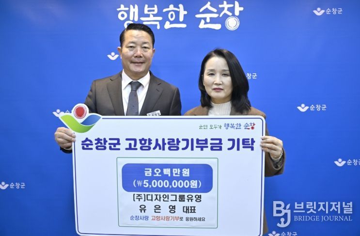브릿지저널 윤나영 기자 | 순창군은 7일 (주)디자인그룹 유영 유은영 대표가 고향사랑기부금 500만원을 기탁했다고 밝혔다.