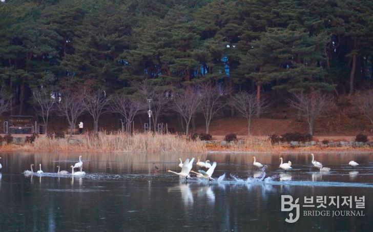 브릿지저널 정보영 기자 | 맑게 갠 하늘 아래 울진군 연호공원에서 겨울 철새 고니가 힘차게 날아오르고 있다.