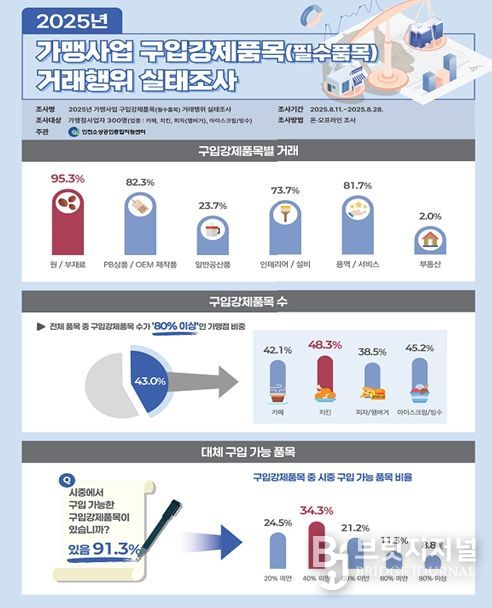 브릿지저널 김경미 기자 | 인천소상공인종합지원센터는 최근 개정된 가맹사업법령 시행 이후 가맹점사업자들이 겪는 경영 환경의 변화 추이를 확인하고 실질적인 고충을 파악하기 위해 실시한 '가맹사업 구입강제품목(필수품목) 거래행위 실태조사' 결과를 발표했습니다.