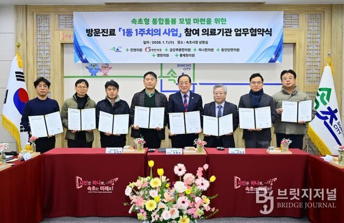 브릿지저널 윤나영 기자 | 속초시가 1월 7일, 시청 상황실에서 관내 7개 의료기관과 통합돌봄 방문진료 ‘1동 1주치의 사업’ 추진을 위한 업무협약을 체결하며 지역사회 기반 통합돌봄 체계 강화에 나섰다.