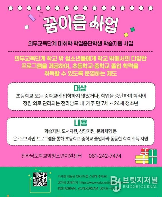 브릿지저널 김경미 기자 | (재)전라남도청소년미래재단 학교밖청소년지원센터(센터장 이윤조)는 2025년 한 해 동안 도내 학교 밖 청소년을 대상으로 ‘의무교육단계 미취학·학업중단학생 학습지원 사업(꿈이음)’을 운영하며, 학습 공백 해소와 배움의 기회 회복을 위한 다양한 지원을 추진했다.