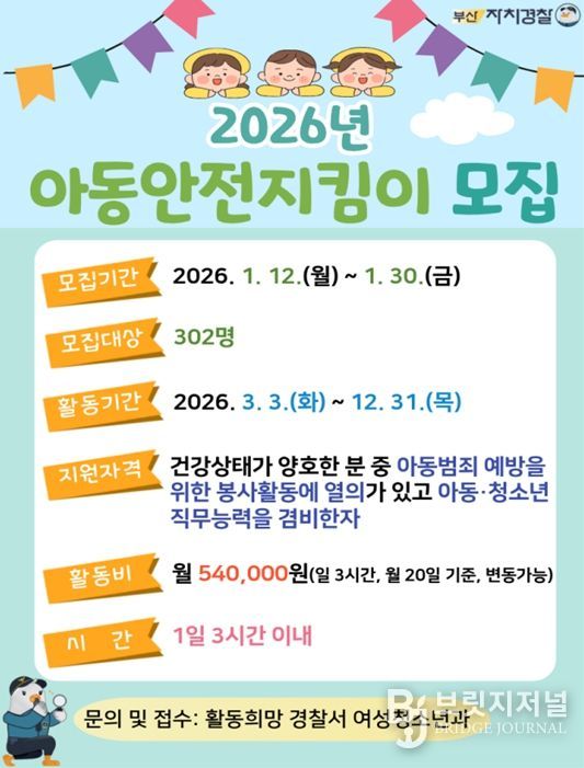브릿지저널 윤나영 기자 | 부산시 자치경찰위원회는 부산경찰청과 함께 오는 1월 12일부터 1월 30일까지 '2026년 아동안전지킴이'를 모집한다고 밝혔다.