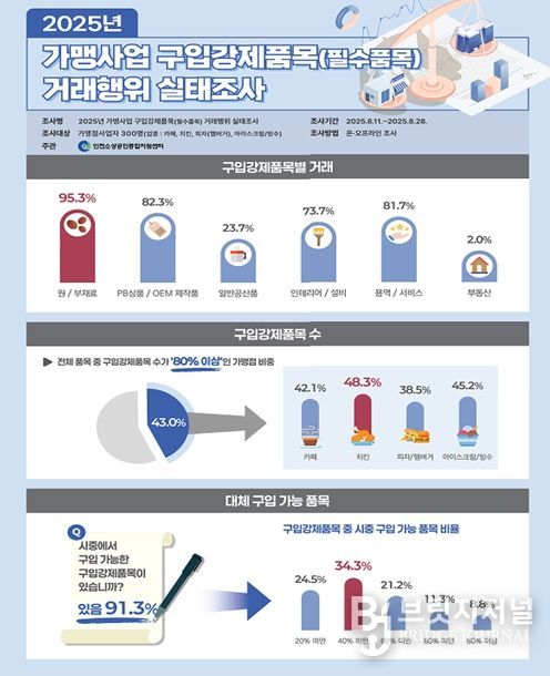 특히, 구입이 강제되는 품목 중 91.3%는 시중에서도 구입이 가능한 것으로 확인되어, 가맹본부의 구입강제품목 지정에 대한 탄력성 제고가 필요한 것으로 분석됐습니다.
