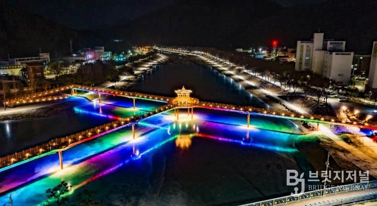 괴산읍 도심을 흐르는 성황천과 동진천 일대는 최근 강추위로 수면이 꽁꽁 얼어붙으면서, 두 하천을 연결하는 에코브릿지 하부에 설치된 다채로운 색감의 경관조명이 얼음 위로 선명하게 비쳐 고요한 겨울밤 속 색다른 장관을 만들어내고 있다.