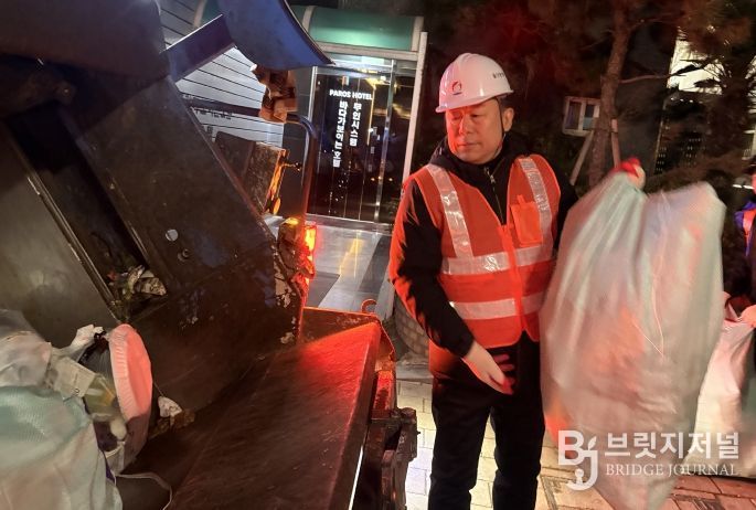 브릿지저널 윤나영 기자 | 김종훈 동구청장은 1월 9일 오전 6시 30분 방어동 일원에서 생활폐기물 수거업체 노동자들과 함께 주민들이 내놓은 쓰레기를 수거하는 현장 체험을 했다.
