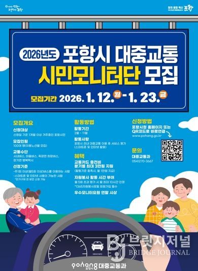 브릿지저널 정보영 기자 | 포항시가 대중교통 이용자의 불편사항을 현장에서 발굴하고 서비스 품질을 개선하기 위해 오는 12일부터 23일까지 ‘대중교통 시민 모니터단’을 모집한다.