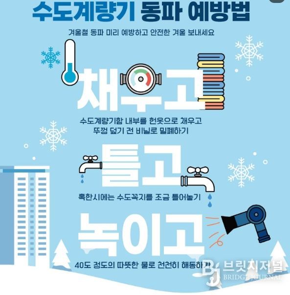 또한 “기온이 급격히 떨어질 때는 계량기함 내부 보온상태를 점검하고, 장기간 외출 시에는 수도꼭지를 조금 열어 물이 흐르도록 하는 등 동파 예방요령을 실천해 주시기 바란다”며, “동파 등 불편 사항 발생 시 관할 시군 상수도부서(야간 당직실)로 즉시 연락해 달라”고 당부했다.