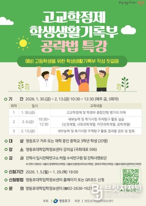 브릿지저널 김경미 기자 | 영등포구가 고교 진학을 앞둔 예비 고등학생을 대상으로 ‘고교학점제·학생생활기록부 공략법’ 특강을 열고, 2029학년도 대학 입시에 대비한 학생부 종합전형 준비 전략을 제시한다고 밝혔다.