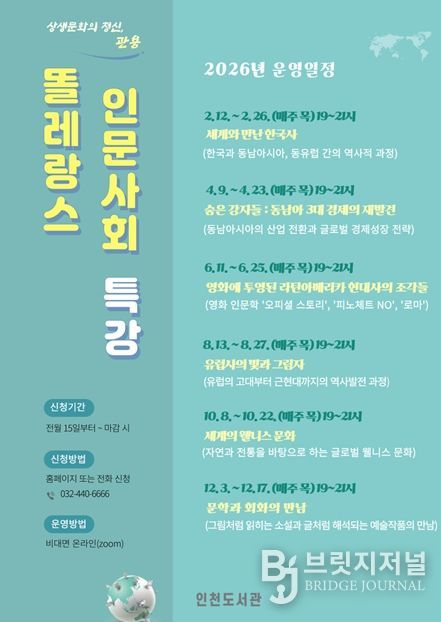 브릿지저널 김경미 기자 | 인천광역시 인천도서관은 일반 시민을 대상으로 인문학적 소양과 사회적 통찰을 함양하기 위한 ‘2026년 똘레랑스 인문사회 특강’을 운영한다고 밝혔다.