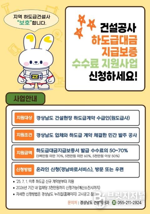 브릿지저널 김경미 기자 | 경상남도가 건설 산업의 활력을 높이고 하도급 업체 보호하기 위해 ‘2026년 건설공사 하도급대금 지급보증 수수료 지원사업’을 확대 추진한다고 밝혔다.