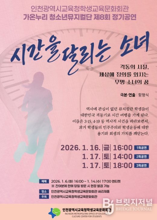 브릿지저널 김경미 기자 | 인천광역시교육청학생교육문화회관은 가온누리 청소년뮤지컬단 제8회 정기공연 ‘시간을 달리는 소녀’를 16일부터 17일까지 싸리재홀 대공연장에서 개최한다.