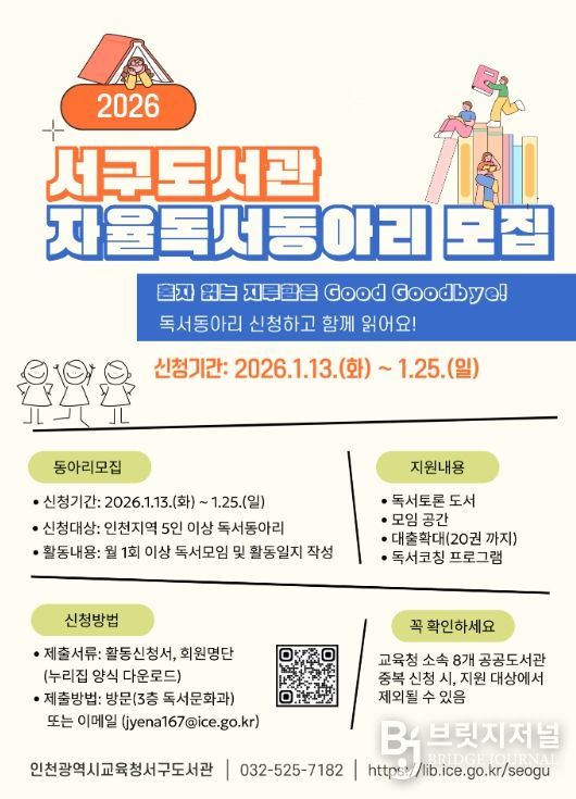 브릿지저널 김경미 기자 | 인천광역시교육청서구도서관은 지역 주민들이 책으로 소통하며 함께 성장하는 즐거움을 나누는 ‘2026년 자율 독서동아리’를 13일부터 25일까지 모집한다.