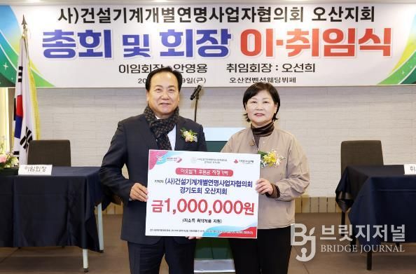 브릿지저널 김경미 기자 | 오산시는 사단법인 건설기계개별연명사업자협의회 오산지회가 저소득 취약계층 지원을 위한 이웃돕기 성금 100만 원을 기탁했다고 밝혔다.